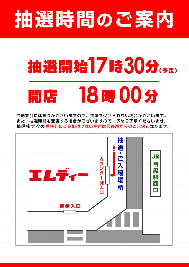 抽選入場となります。17時30分よりカウンター側入口にて抽選を行います。抽選後すぐに再整列となります。