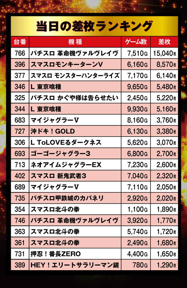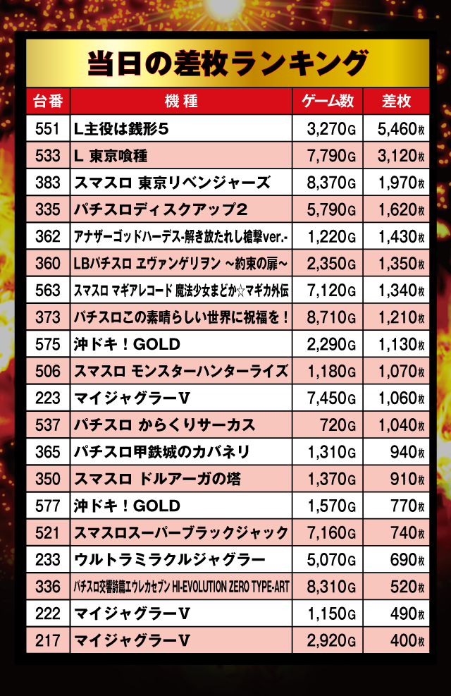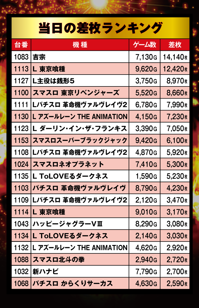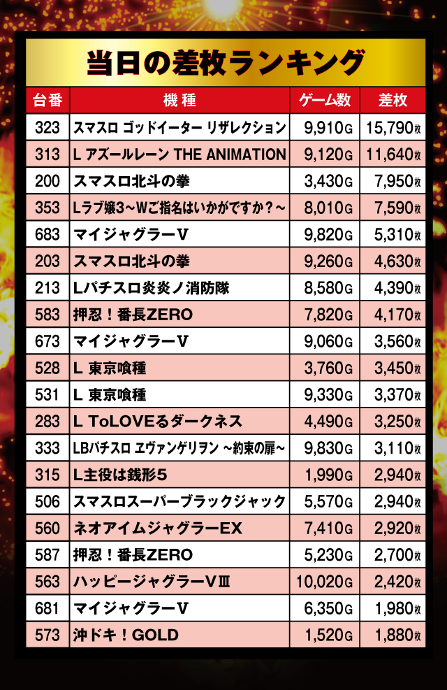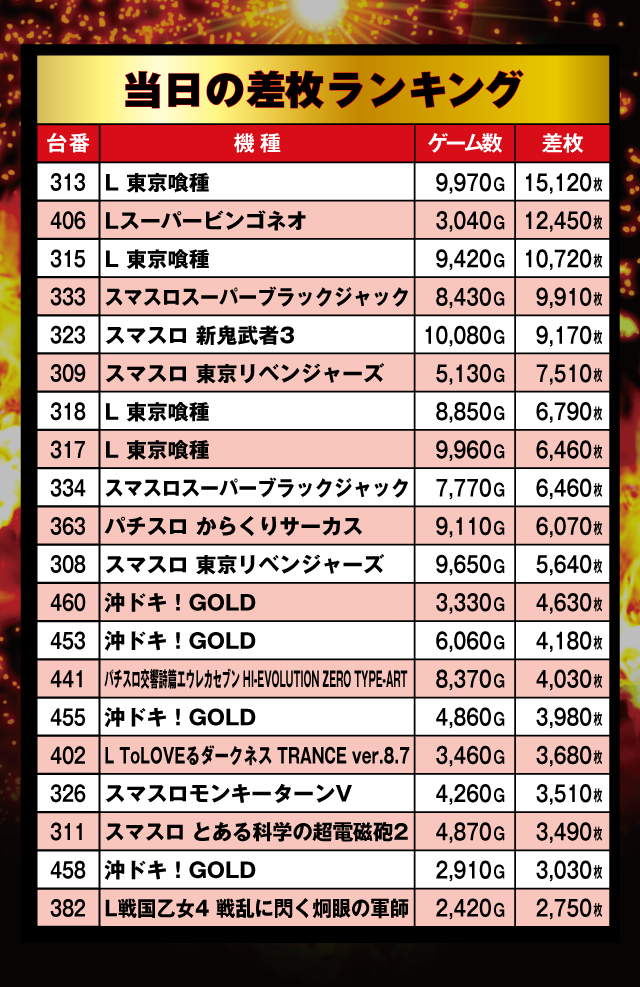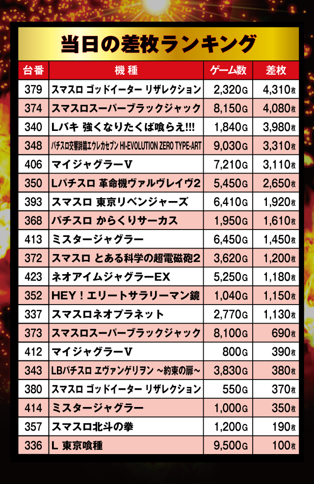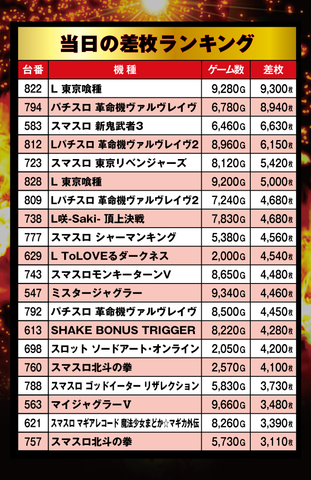 取材当日のしにせえず各店の華々しい結果の数々を、いち早く結果レポートとして公開。ぱちタウンが独自に選び抜いた機種たちと、各店の差枚ランキングに注目だ。データの詳細は以下を要チェック‼