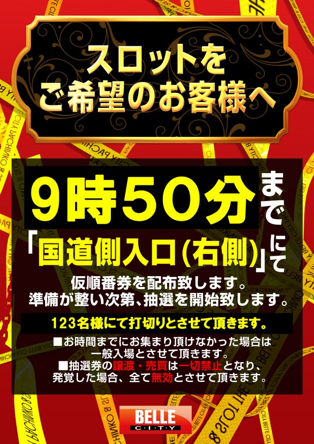 スロットは抽選〆切り9:50 パチンコ10:00より並んだ順番での入場 |