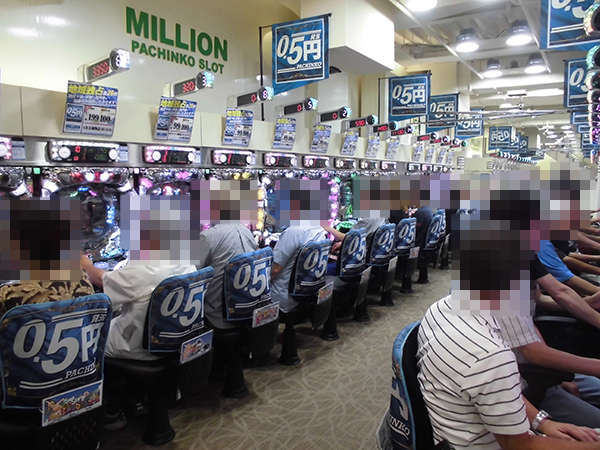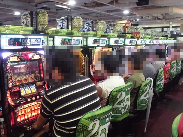 午後の20円パチスロで、とくに活気づいていたのがジャグラーシリーズ。ポテンシャルを発揮できているといったプレイヤーが多く、シマ全体に鮮やかな光景が広がっていた。