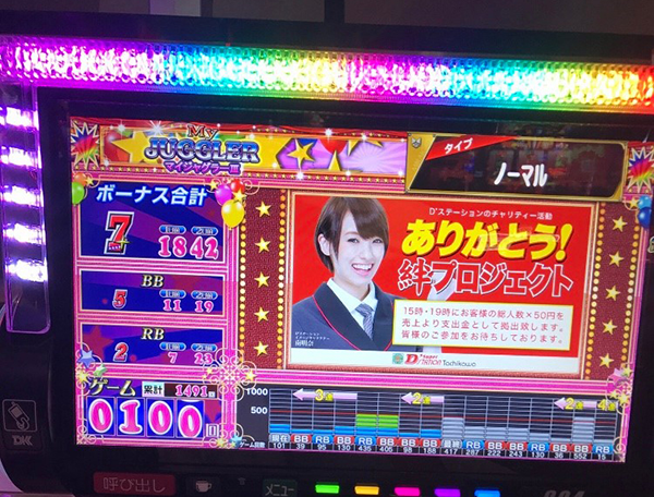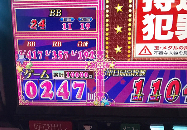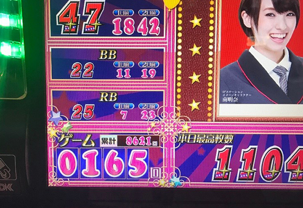 ゲーム数を伸ばすチャンスではあるのだが、ボーナスがBIGに偏った影響で12時頃の総ゲーム数は1500Gにも届いていなかった。