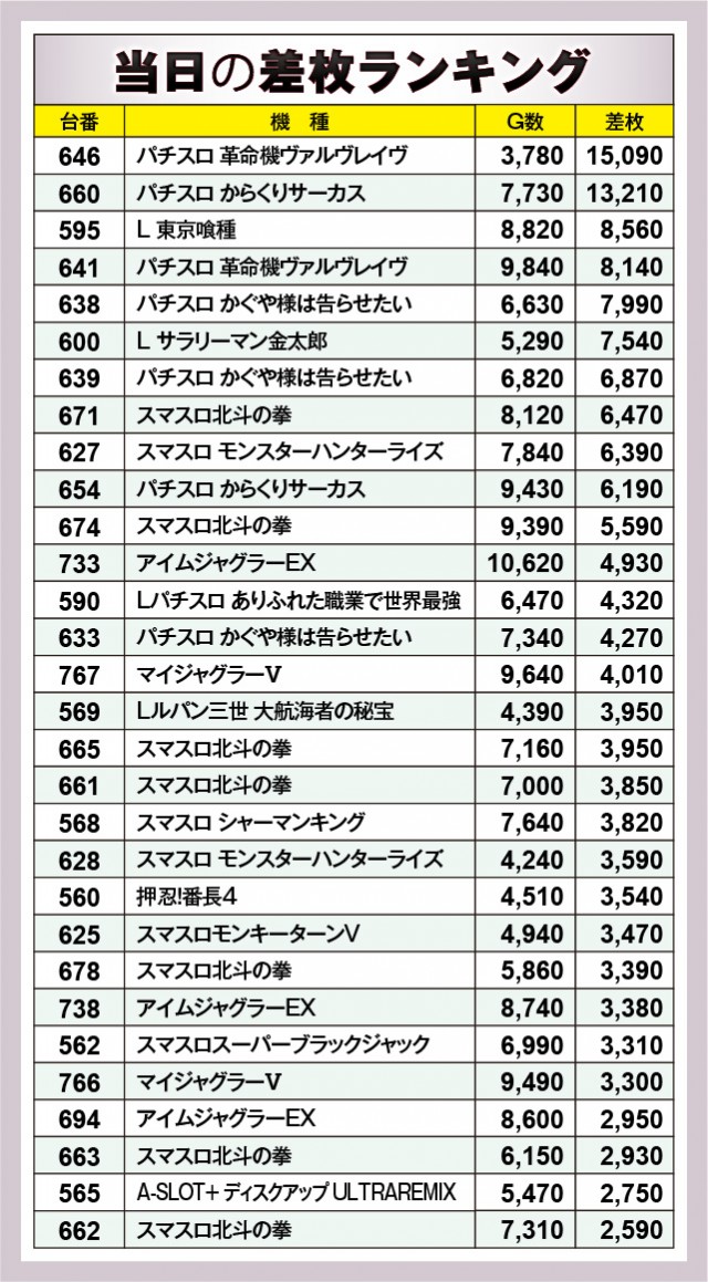 『パチスロ 革命機ヴァルヴレイヴ』『パチスロ からくりサーカス』にて万枚OVERが発生し、さらに『L 東京喰種』も8,000枚OVERを達成するなど、各所で熱気が噴出していた。そして回転数に着目すると、『アイムジャグラーEX』の万回転OVERを筆頭に終日を通して打ち込まれた台が見られ、店内は大きな盛り上がりに包まれていたと言えるだろう。ファンは手応えを感じながらレバーを叩き、満足度の高い1日を過ごせたはずだ。