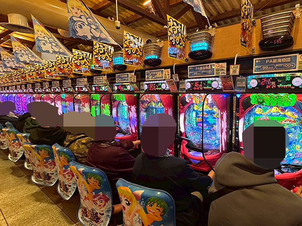 16時ごろの100円/89玉パチンコの様子を見ると「PA新海物語」といった甘海シリーズや、「PAコマコマ倶楽部 with 坂本冬美 ごらくバージョン」、「P冬のソナタ My Memory Sweet GORAKU Version」などの自社開発機が大盛り上がり。機種性能を存分に発揮するプレイヤーを目の当たりにしている。