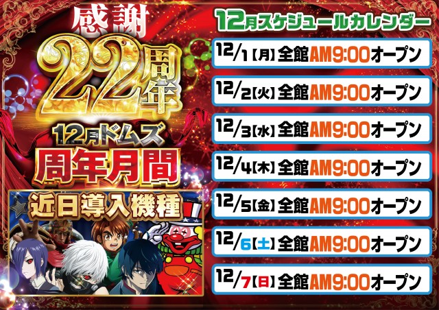 明日9日(火)💓周年月間ドムズ💓休まず営業❗全館9時開店💓💓