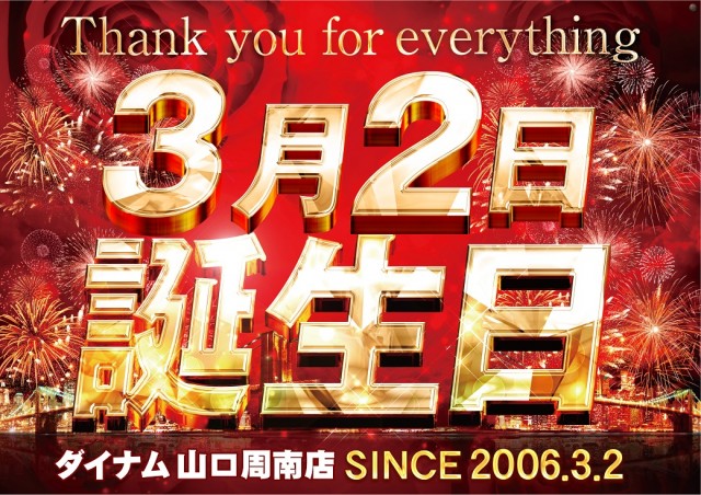 明日3/2(日)は、ダイナム周南店の誕生日!