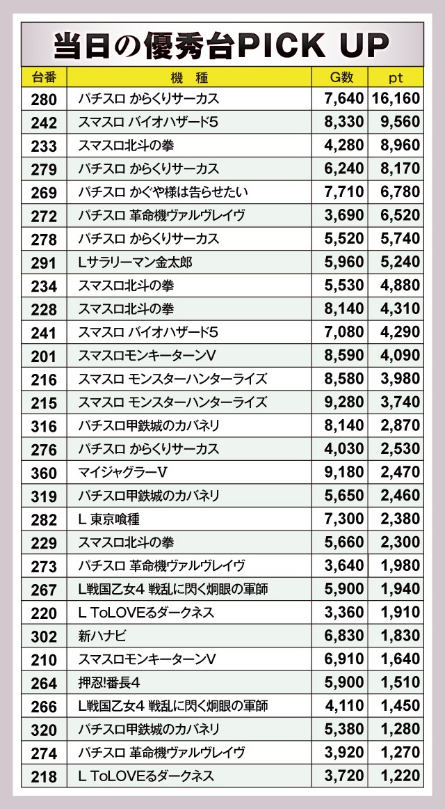 この日は『パチスロ からくりサーカス』280番台が1万ptオーバーを達成!次いで『スマスロ バイオハザード5』242番台が+9,000ptオーバー、『スマスロ北斗の拳』233番台や『パチスロ からくりサーカス』279番台が+8,000ptオーバーと素晴らしい結果を残している。