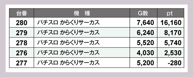 『パチスロ からくりサーカス』は280番台が+16,160ptで見事ランキング1位を獲得。さらに279番台+8,170pt、278番台+5,740ptと大盛況だった。