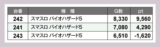 『スマスロ バイオハザード5』は3台中2台が大幅プラスで、特に242番台は+9,560ptと見事なパフォーマンスを披露していた。