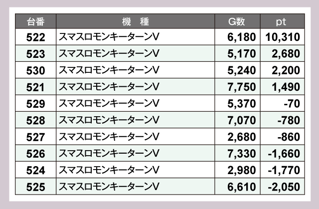 『スマスロモンキーターンV』522番台が+10,310ptと、ひときわ輝く成績をおさめていた。そして『スマスロ ゴッドイーター リザレクション』538番台が+7,560pt、『Lルパン三世 大航海者の秘宝』493番台が+7,090ptと誰もがうらやむptがつづく。以下『スマスロ ゴッドイーター リザレクション』539番台の+6,820pt、『スマスロ モンスターハンターライズ』481番台の+6,140ptなどなど、前回に負けじと優秀台が続出していた。