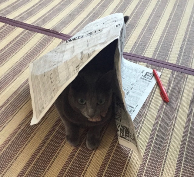 ※面白いくらいに当たらず、放置しておいた競馬新聞(東スポ)で戯れていたおかゆ