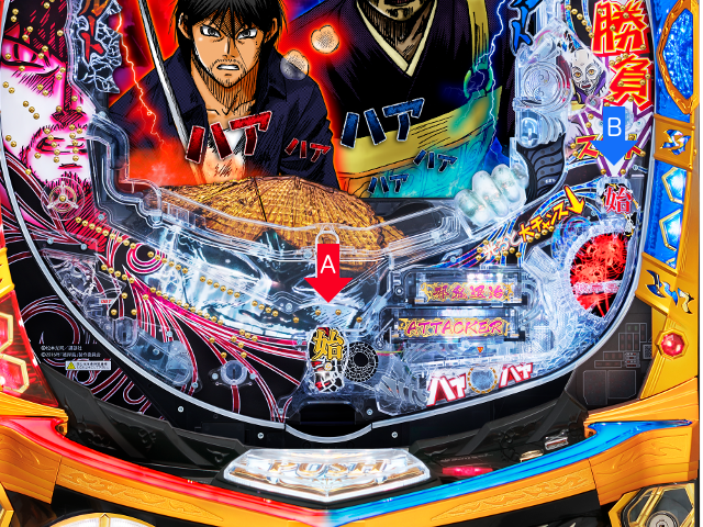 通常時に左打ちして「A」に玉を入れて回すか、右打ちして「B」で回すかによって、スペックは全くの別物になります。