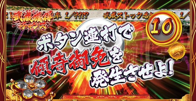 また、通常時はCZ失敗時の復活抽選やCZ成功時の武威ストック獲得抽選に関わる「傾奇玉」の獲得抽選が行われており、傾奇玉を多く獲得している状態でCZに当選するほどAT期待度がアップします。