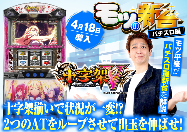 「サモンズロード」と「クロスラッシュ」、2つのATをループさせることにより、出玉を伸ばす『十字架5』は4月18日より順次、全国導入予定。