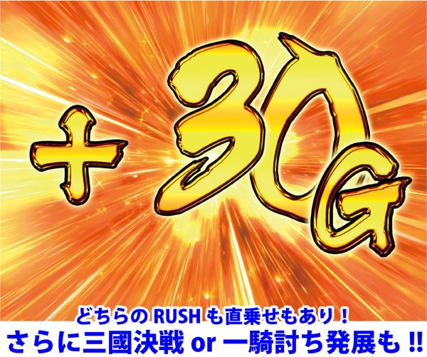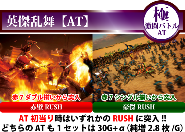 赤壁RUSHは初当り時ならば、必ず豪傑RUSHをストックと大量獲得のチャンスとなっている。また、それぞれのATには特徴があり、赤壁RUSHは三國決戦高確率、豪傑RUSHは一騎討ち高確率状態となる。