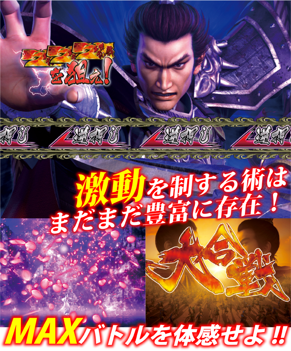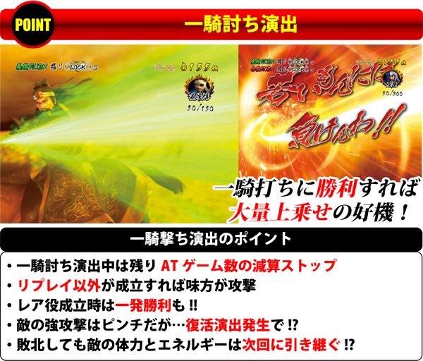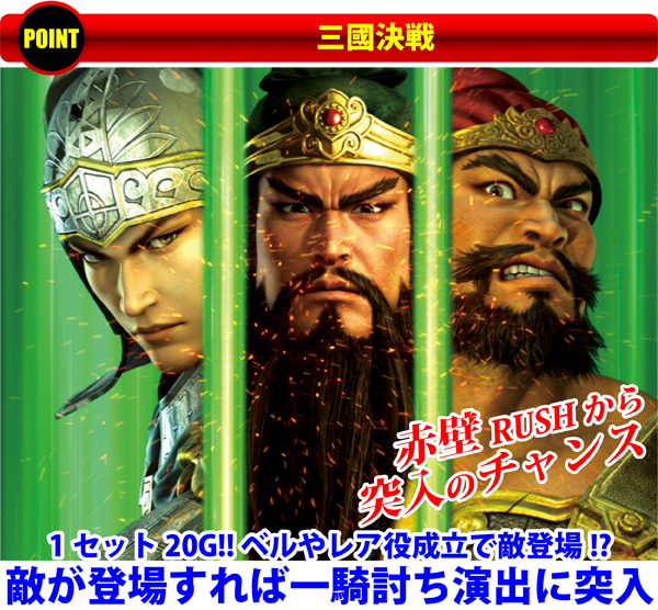 バトルスパイラルと銘打たれた3種類のAT「豪傑RUSH」・「赤壁RUSH」・「三國決戦」と上乗せ演出である一騎討ちが一体となって展開していくゲーム性が魅力だ。