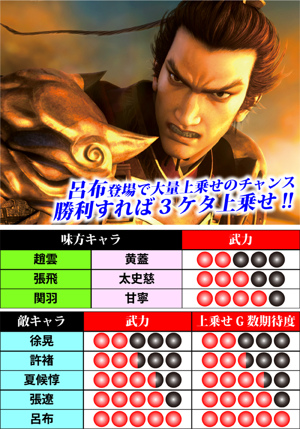 呂布との対決は勝利すれば3ケタゲーム数の上乗せが濃厚だ。敵を倒したあとに発生するゲーム数上乗せ演出(奥義一閃)では背景の色に注目。青<緑<赤<虹の順に期待度は高い。