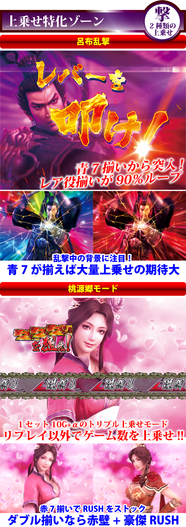 青7揃いから突入する「呂布乱舞」はレア役が90%ループで揃う。背景の色にも注目だ。演出中に青7が揃えば、大量上乗せゲーム数獲得のチャンス!?