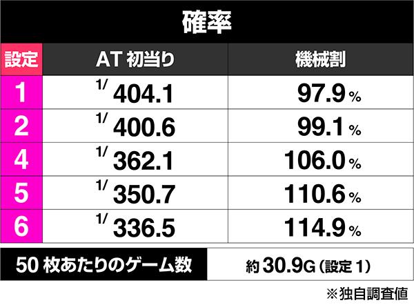さて、ここからは今回のショールーム実戦で判明した設定推測ポイントをご紹介していきましょう。まずひとつ目は「AT初当り確率」。上の表が公表されている数値で下の表が実戦値となります。