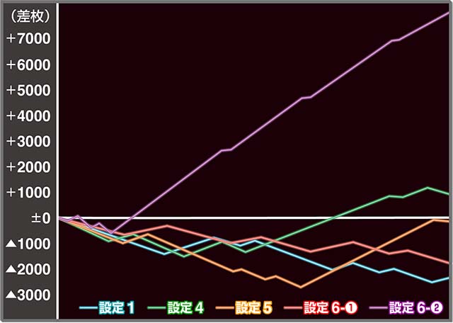 設定6-②のデータは完全に振り切って圧巻のグラフですが、その他はプラマイゼロ付近のものやマイナス収支のデータも見られます。