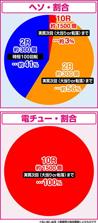 そしてチャンスタイムは時短100回転なので、引き戻しが十分に狙えます。せっかく初当りを引いたのに、あっという間に通常時へ…なんて悲しい展開におびえる必要はありません! 時短引き戻しを含む、初当り時のRUSH突入率は約72.5%と、安定感バツグンなのが魅力です。さらに初当りの約3%は出玉1500個を獲得してからRUSHに挑める、というのも嬉しいポイント♪