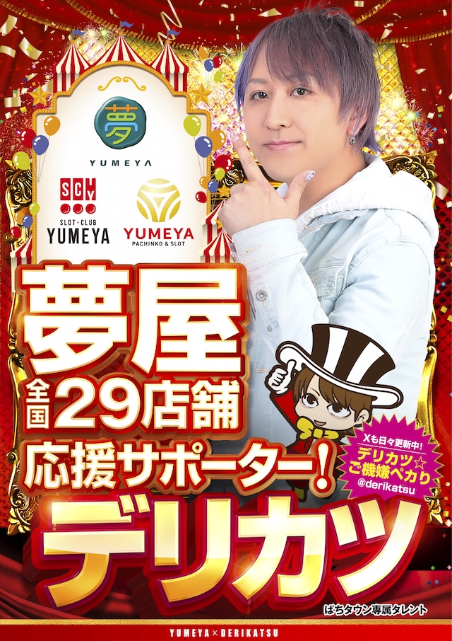ビッグニュース! ぱちタウン専属タレントのデリカツ(@derikatsu)が、夢屋グループ全国29店舗の応援サポーターに就任しました!
