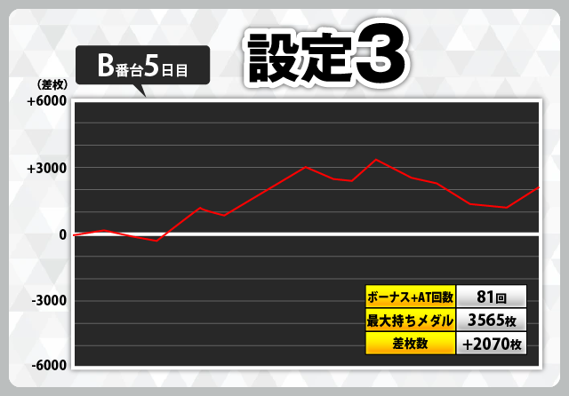 | 3 | +2795枚(設定4) | −3604枚(設定1) |