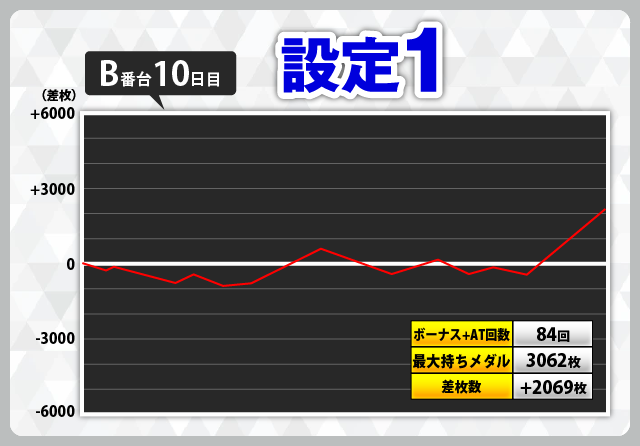 また、10日目A番台(設定4)の+2795枚、10日目B番台(設定1)の+2069枚と、中間・低設定からも2000枚オーバーの勝利がありました。