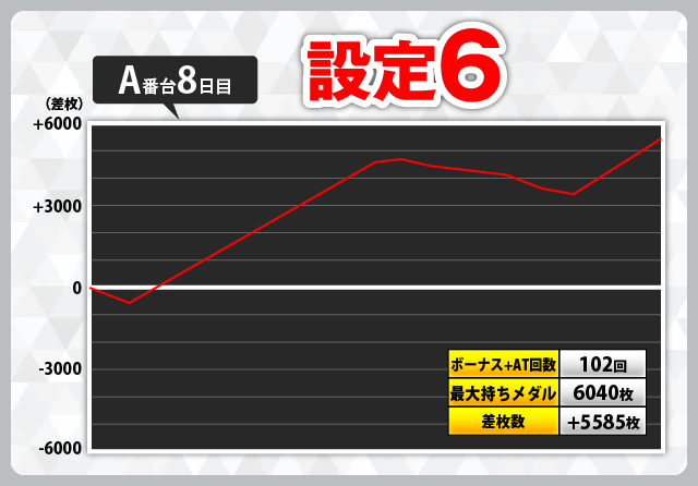 まずは、1度だけ使用された設定6のスランプグラフを見てみましょう。3日目のA番台は安定したグラフを描き、持ちコインは最大で5687枚、最終的に差枚数は+2779枚と、これぞ高設定といった結果になっています。