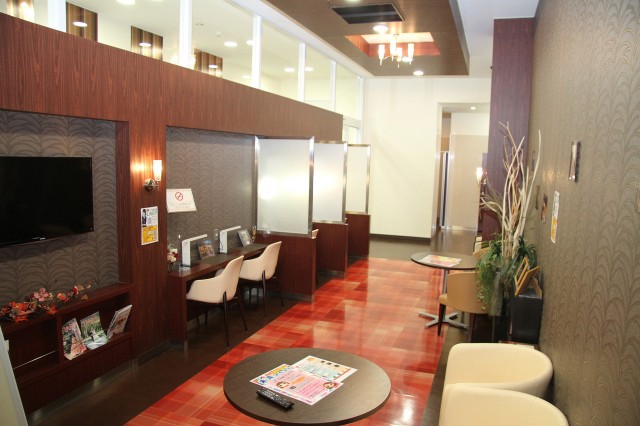 ゆったりソファーに広〜い化粧スペース、さらに靴をぬいでくつろげるお座敷コーナーもあってビックリ!!
