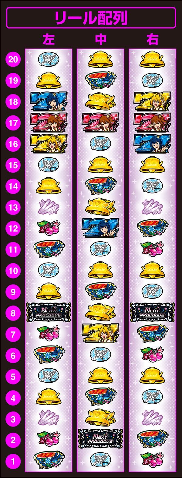 んほおおおおおおっ! 初代の配列にそっくり! ちょっと違うけどね。左リール青7の下のBARがないとか、右リール青7の下が松じゃなくてリプレイだとか、中リールの松チェ松が松リプ松になっていたりだとか。でもそんなのは細かいところです。まず左リールの姫周りが変わっていないんだから、それでいいじゃない! 僕はボーナス判別で左リールの中段にチェリーがない方の姫を狙うのが好きでねぇ。