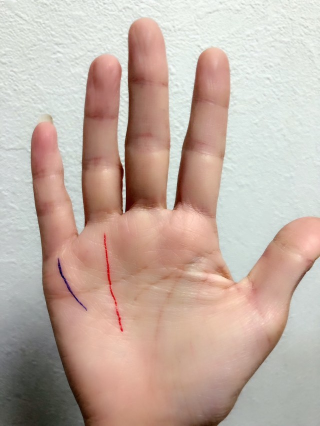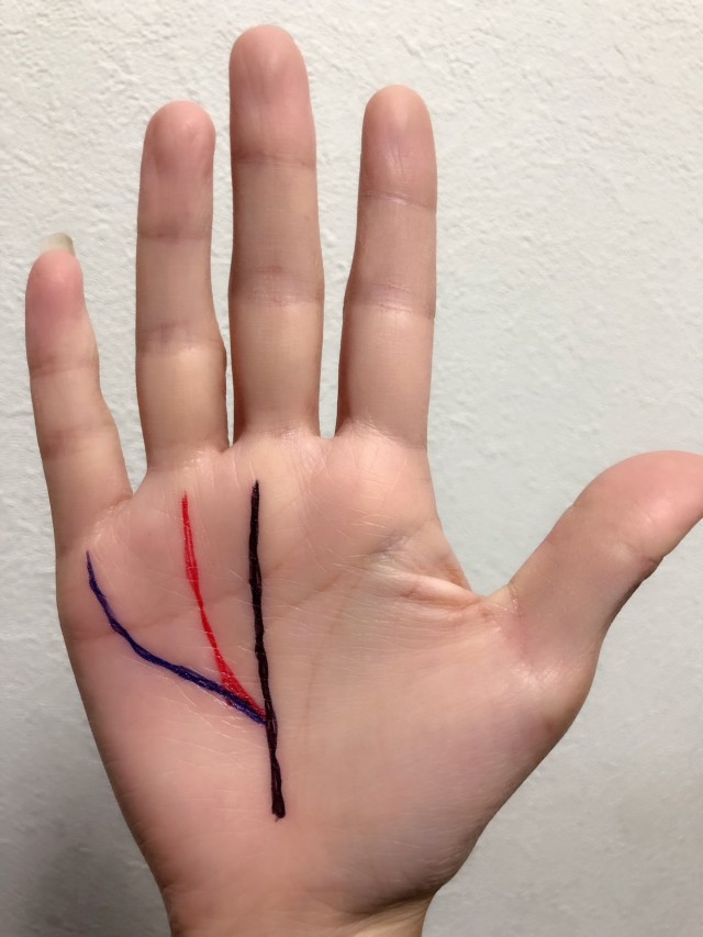運命線(黒線)と太陽線(赤線)と財運線(青線)