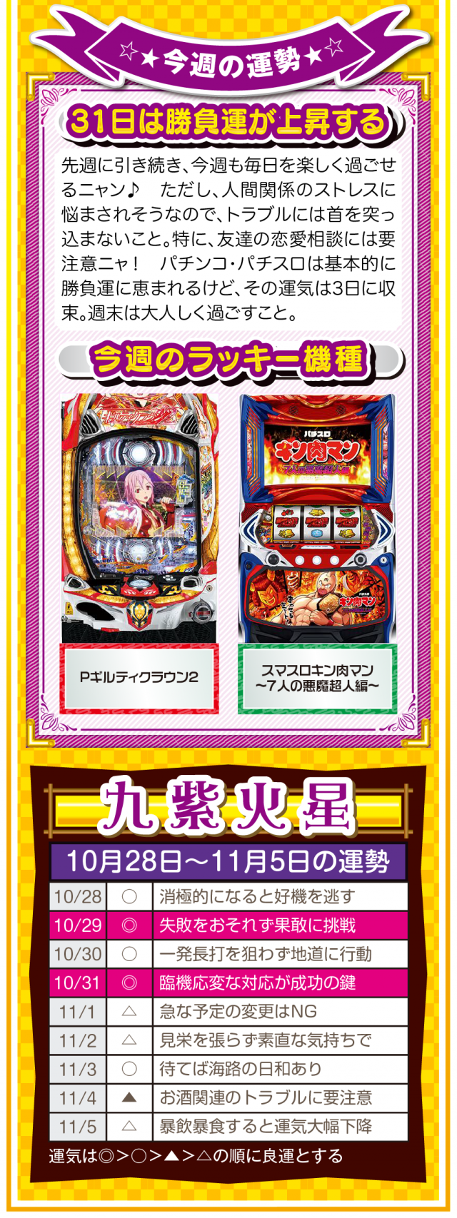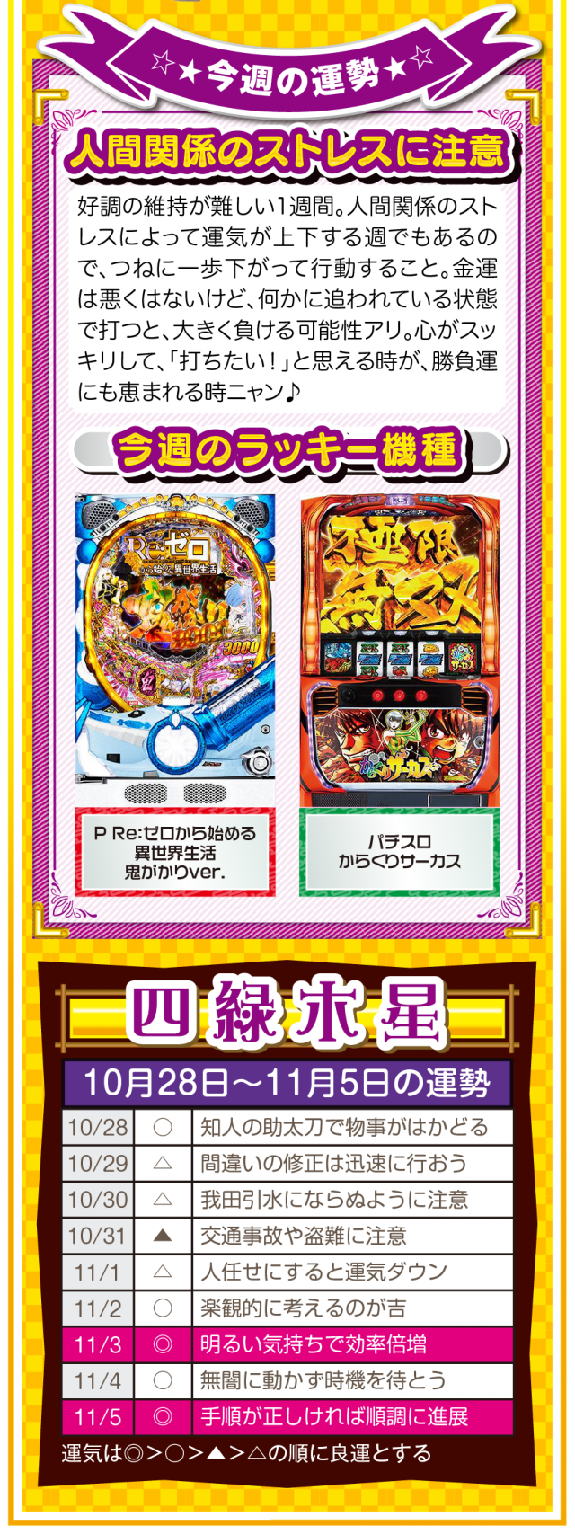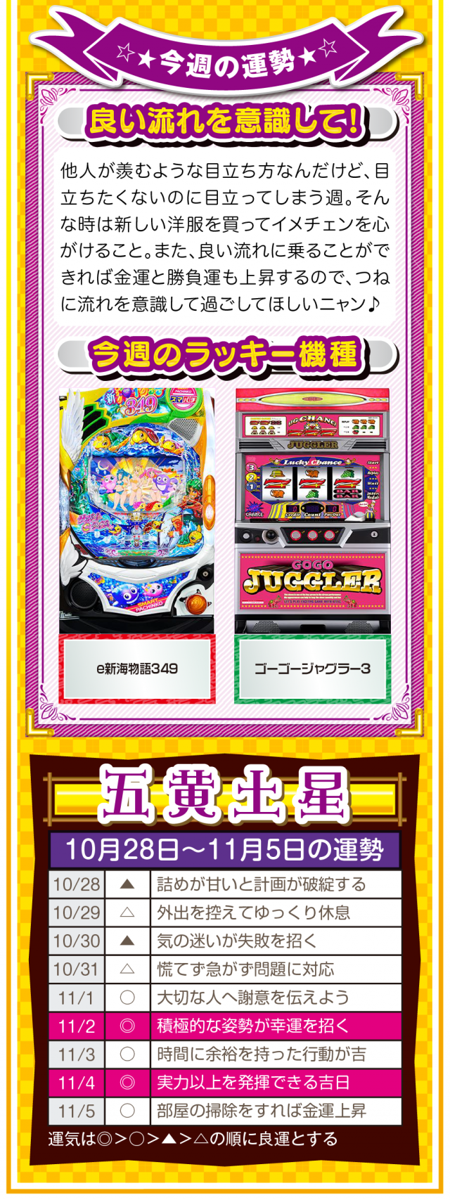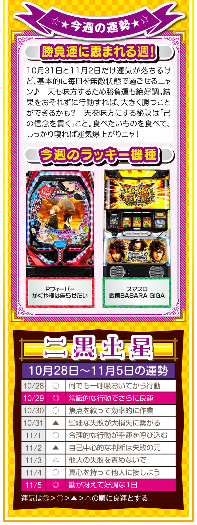 あなたの周りにある「人の輪」が「感謝の輪」になった時、あなたに素晴らしい運気と良い流れが訪れていることを覚えておいてほしいニャン♪ というわけで早速、10月30日から11月5日の1週間を鑑定ニャ(流れが悪い時は自宅に引きこもりがちのフォー・チュンチュンが、今週もオマケとして28日と29日の運勢も鑑定したニャン♡)!
