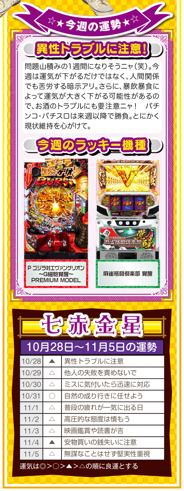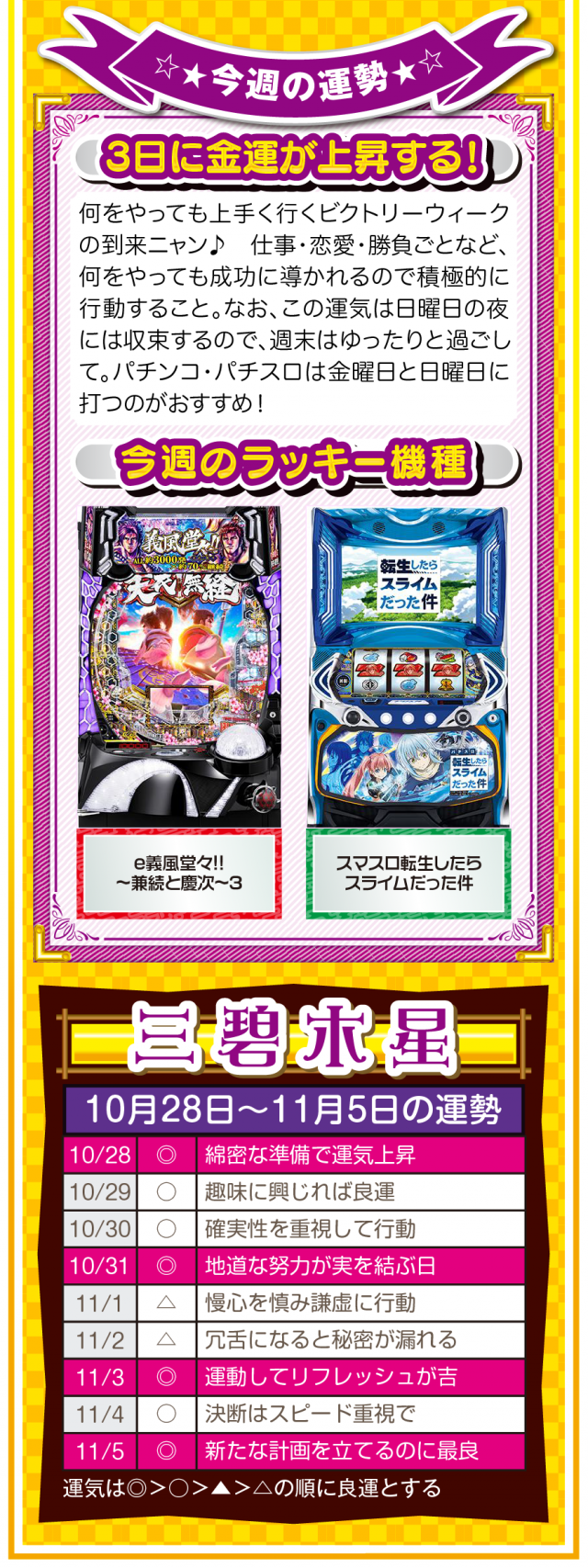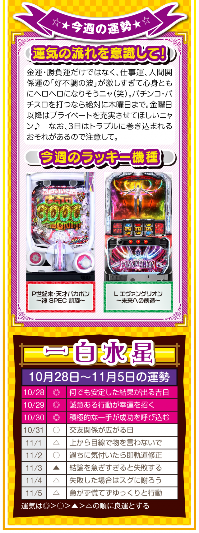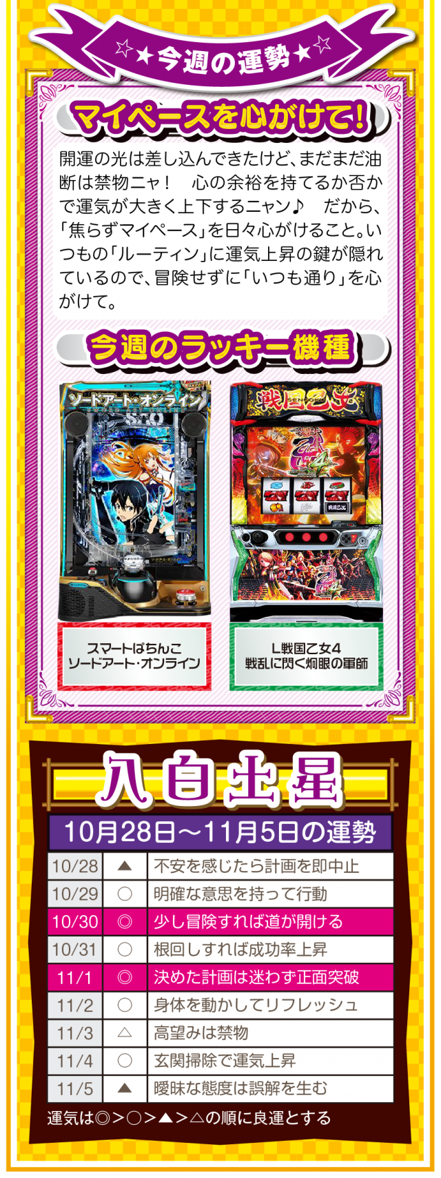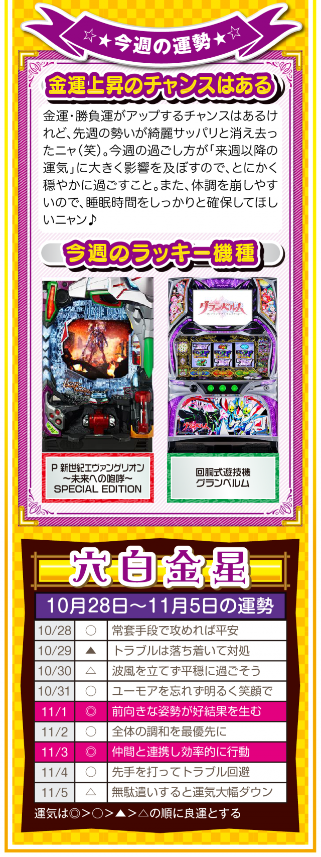 あなたの周りにある「人の輪」が「感謝の輪」になった時、あなたに素晴らしい運気と良い流れが訪れていることを覚えておいてほしいニャン♪ というわけで早速、10月30日から11月5日の1週間を鑑定ニャ(流れが悪い時は自宅に引きこもりがちのフォー・チュンチュンが、今週もオマケとして28日と29日の運勢も鑑定したニャン♡)!