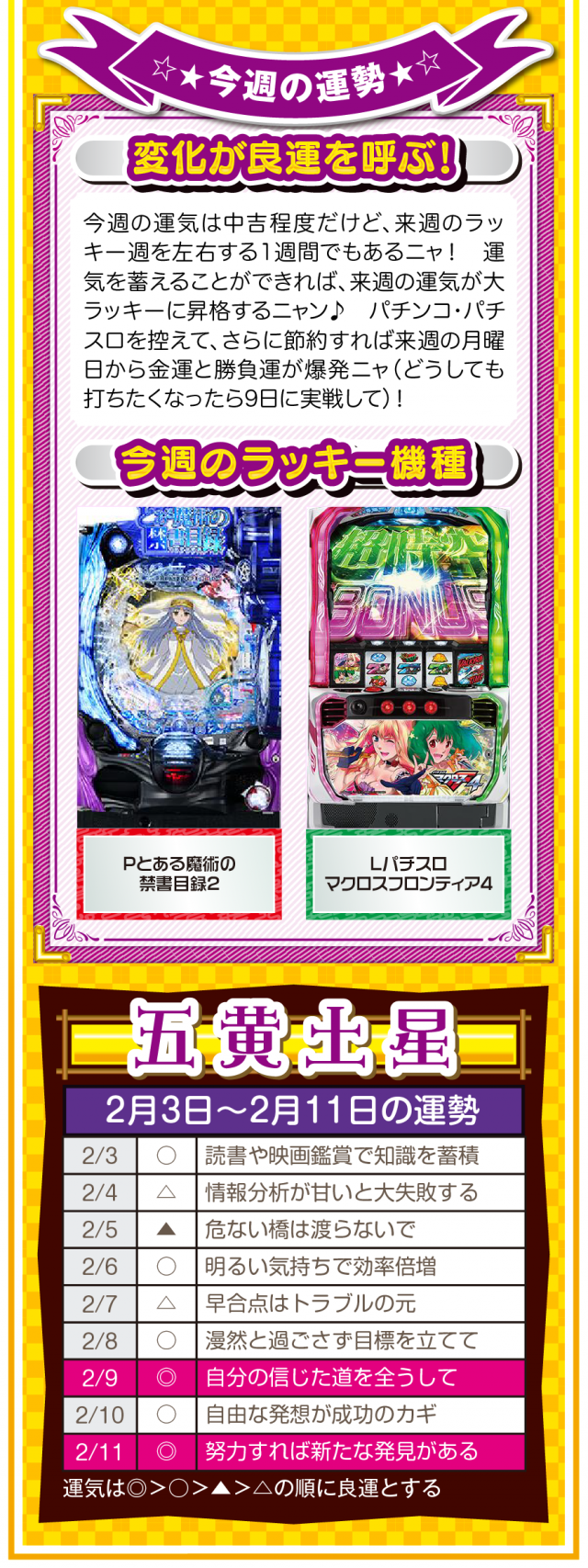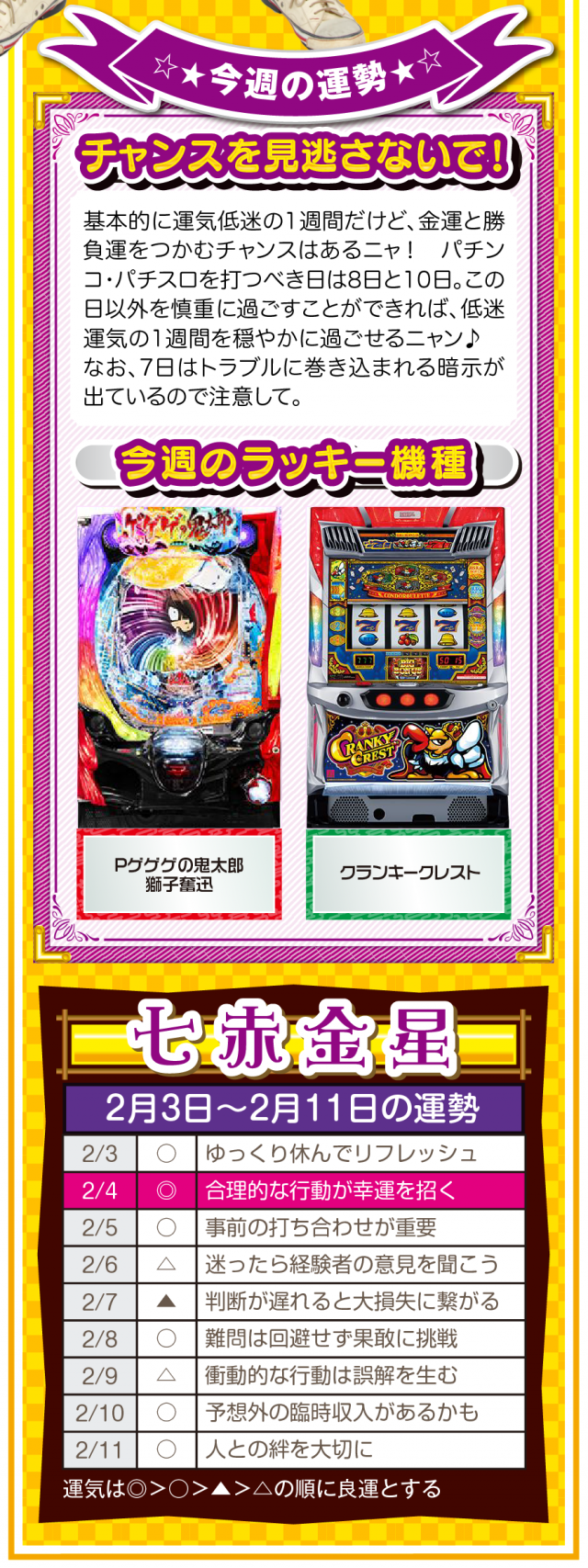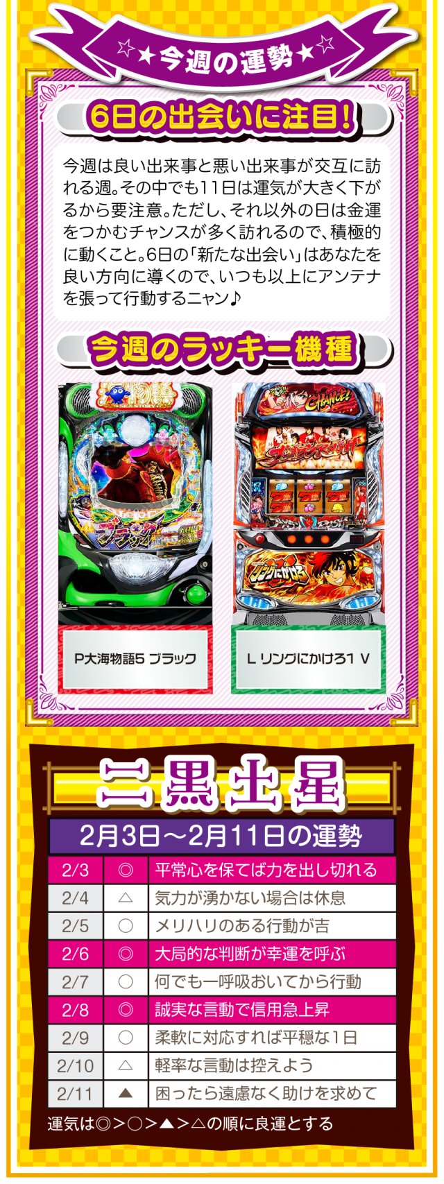 幸せな人は幸せを繋ぎ、幸せな人を中心にして「幸せの輪」ができることを覚えておいてほしいニャ! というわけで早速、2月5日から11日の1週間を鑑定ニャン(バレンタインを目前にしてアタフタしているフォー・チュンチュンが、オマケとして3日と4日の運勢も鑑定したニャン♡)!