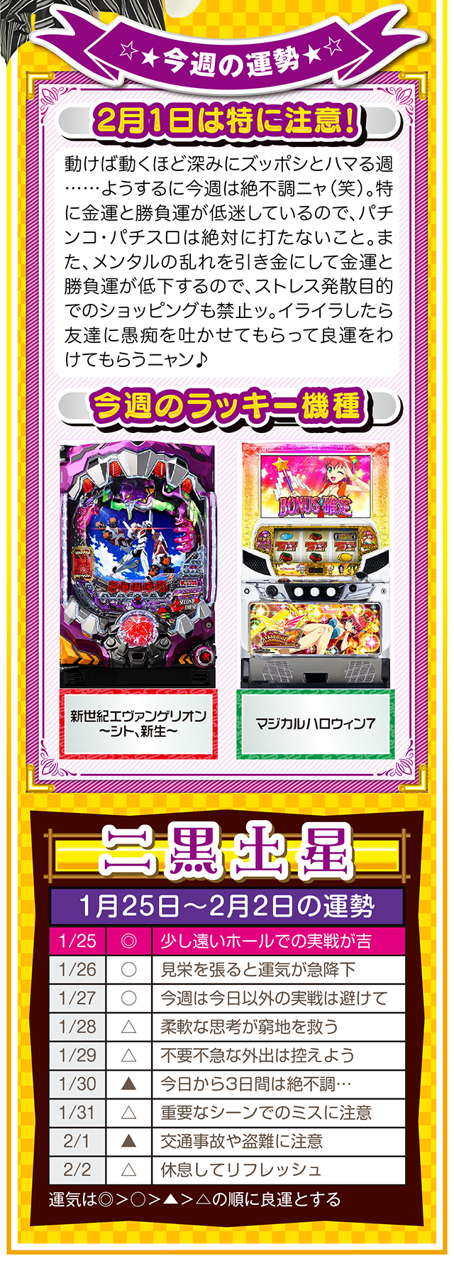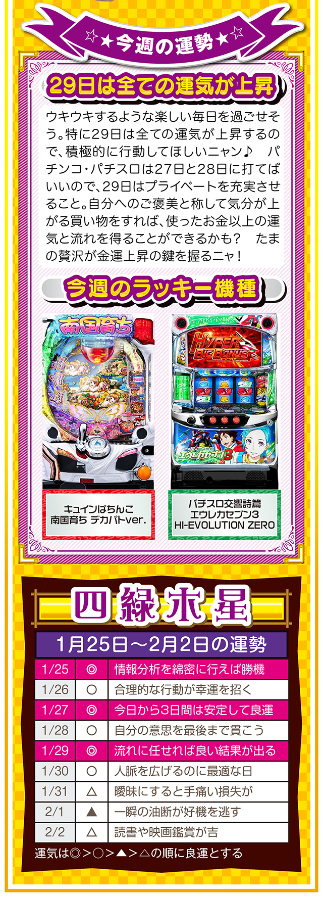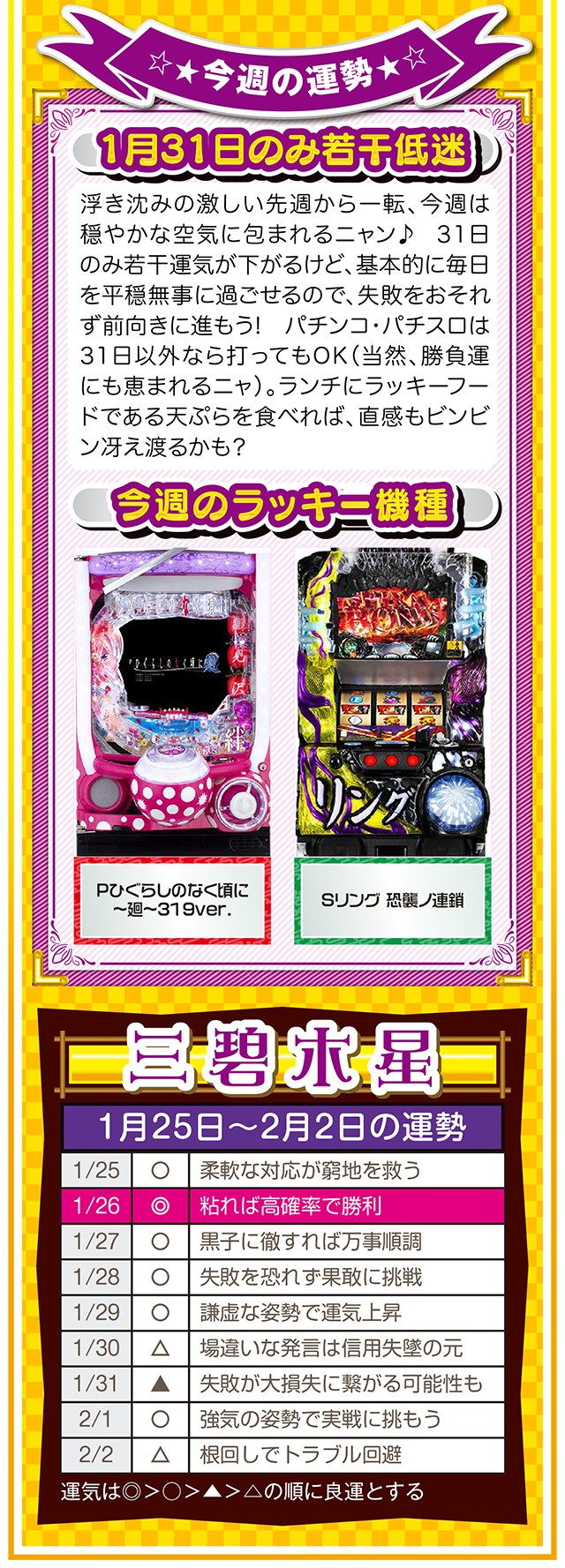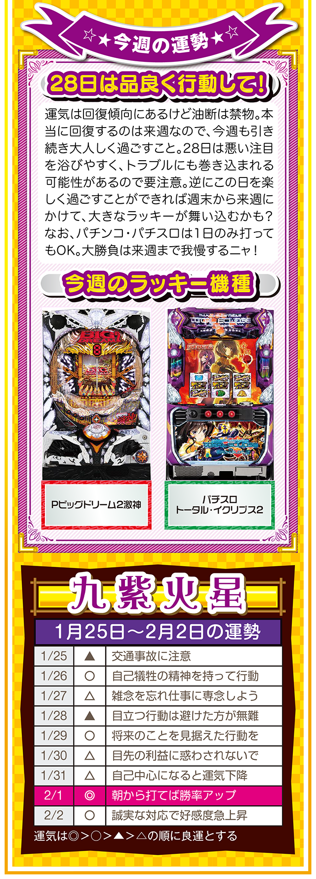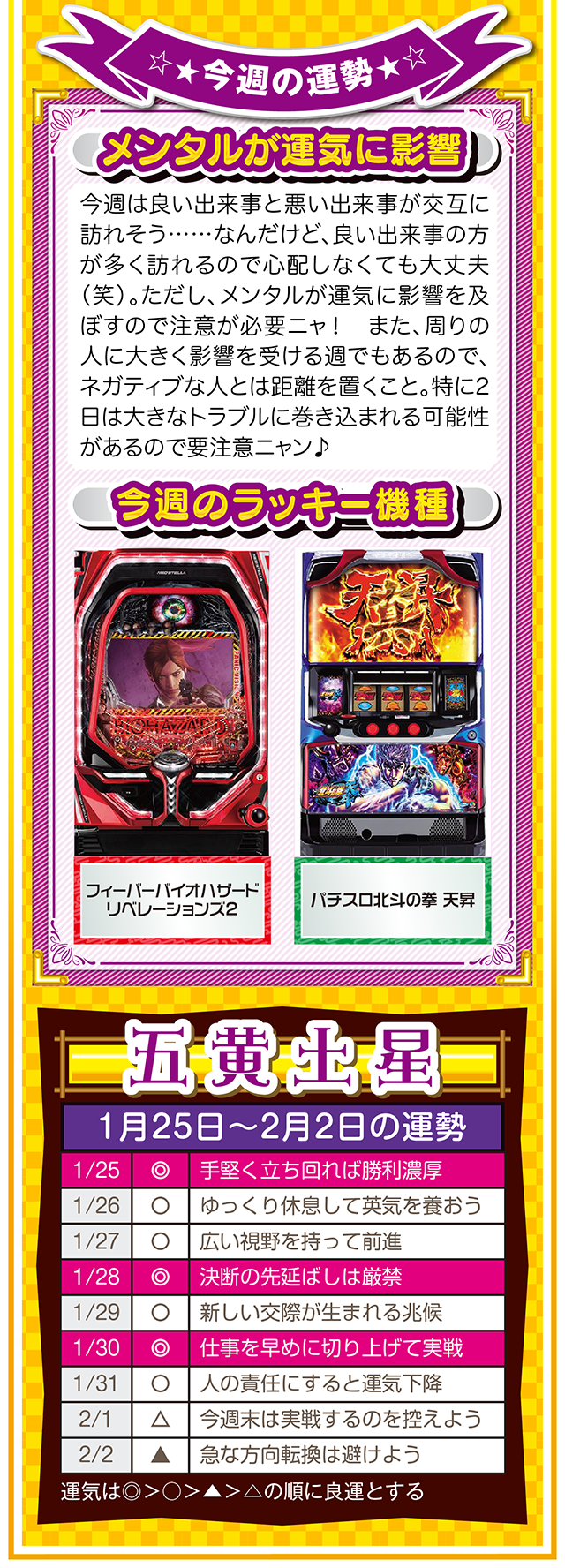 部屋の掃除はもちろん(特に玄関とトイレ)、風邪をひかないよう自己管理を徹底して、喜びと楽しみに満ちあふれる「新時代」を迎えてほしいニャ……というわけで早速、1月27日から2月2日の1週間を鑑定ニャ(一白水星のフォー・チュンチュンはケンタッキーフライドチキンをむさぼりつつ、オマケとして25日と26日の運勢も鑑定したニャン♡)!