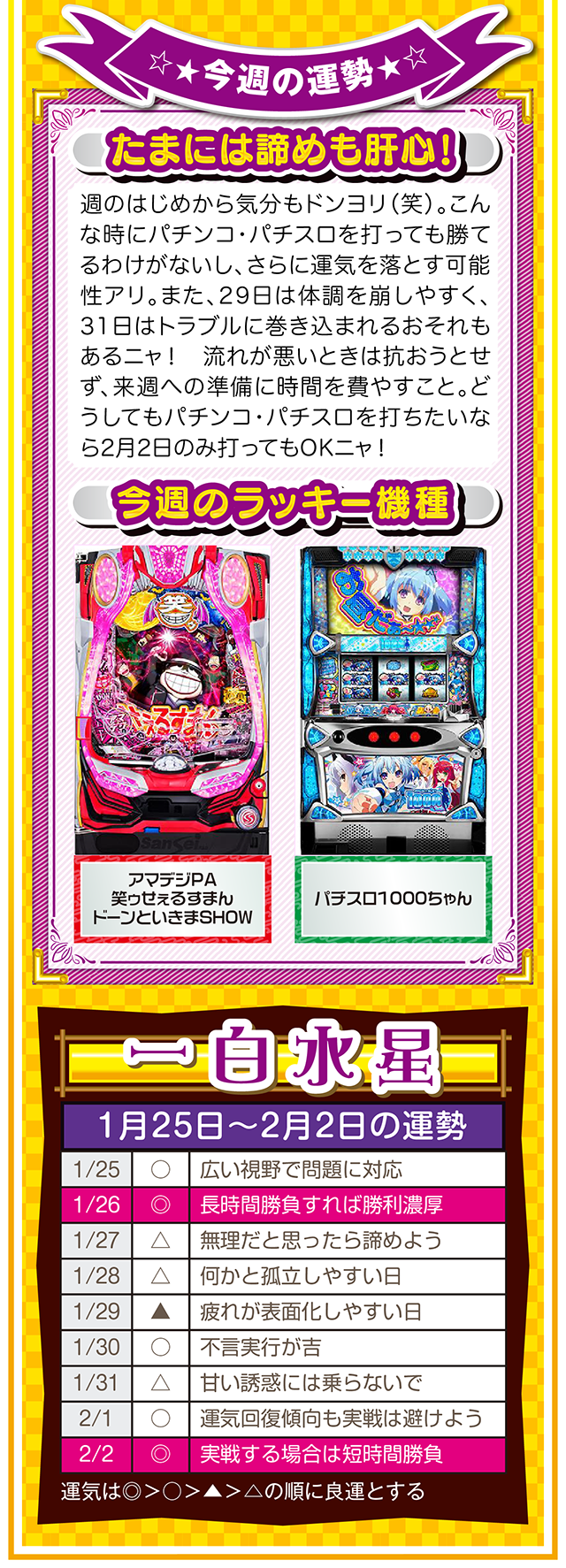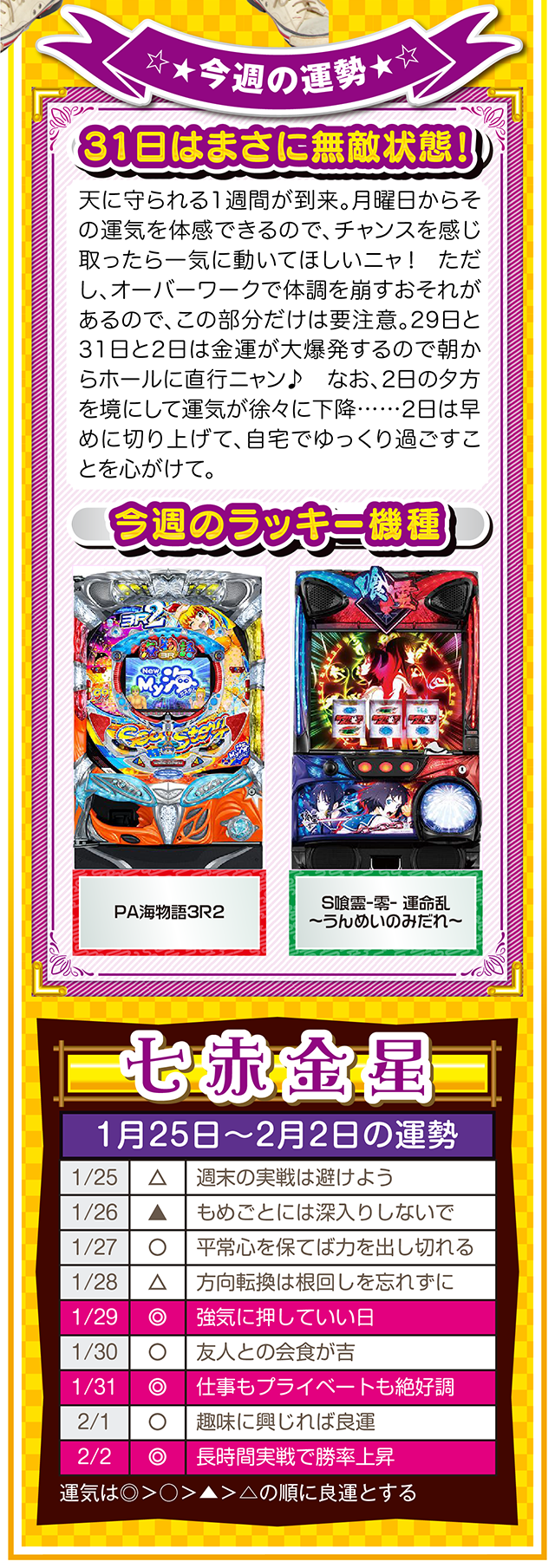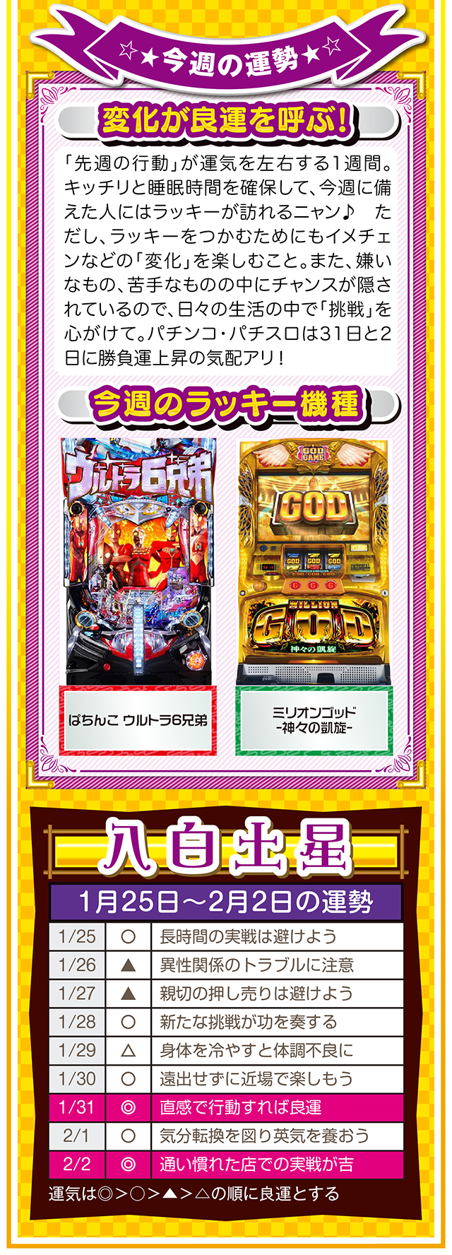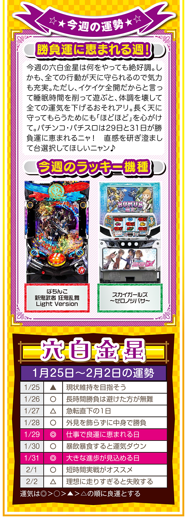 部屋の掃除はもちろん(特に玄関とトイレ)、風邪をひかないよう自己管理を徹底して、喜びと楽しみに満ちあふれる「新時代」を迎えてほしいニャ……というわけで早速、1月27日から2月2日の1週間を鑑定ニャ(一白水星のフォー・チュンチュンはケンタッキーフライドチキンをむさぼりつつ、オマケとして25日と26日の運勢も鑑定したニャン♡)!
