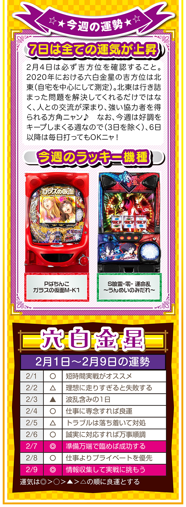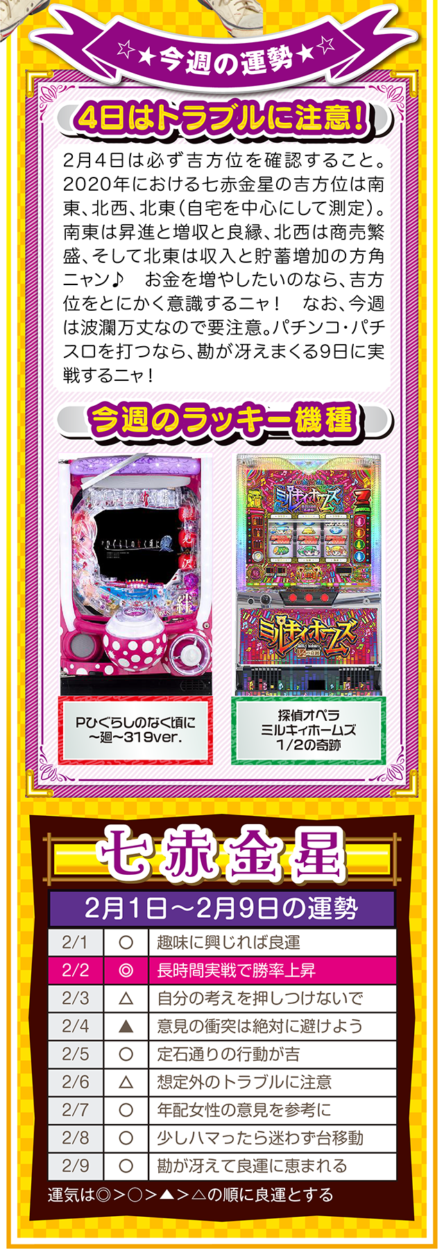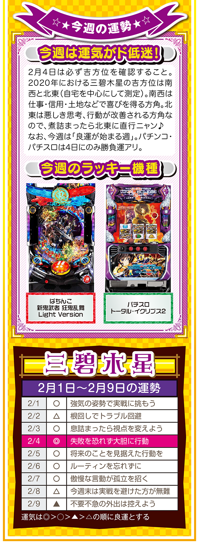 良い運気は待っていても訪れないので、とにかく行動あるのみ。今年も大吉日は訪れるので(大吉日は近日公開予定)、その日は運気を上げるためにもお水取りに出かけてほしいニャ(特に三碧木星・四緑木星・九紫火星の人)……というわけで早速、2月3日から9日の1週間を鑑定ニャ(変化運のフォー・チュンチュンは苦手なパクチーを頬張りつつ、オマケとして1日と2日の運勢も鑑定したニャン♡)!