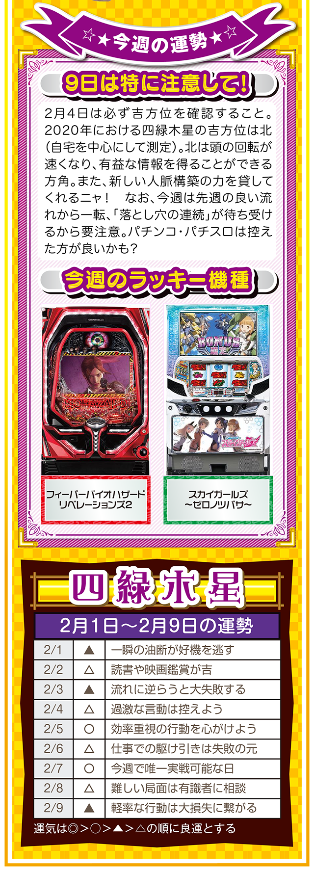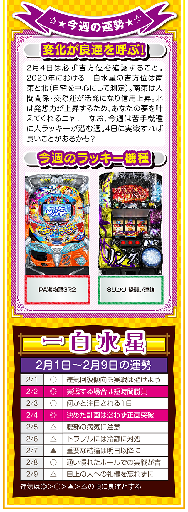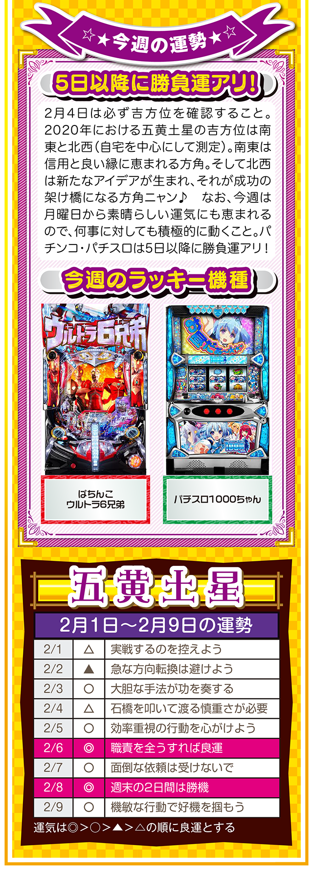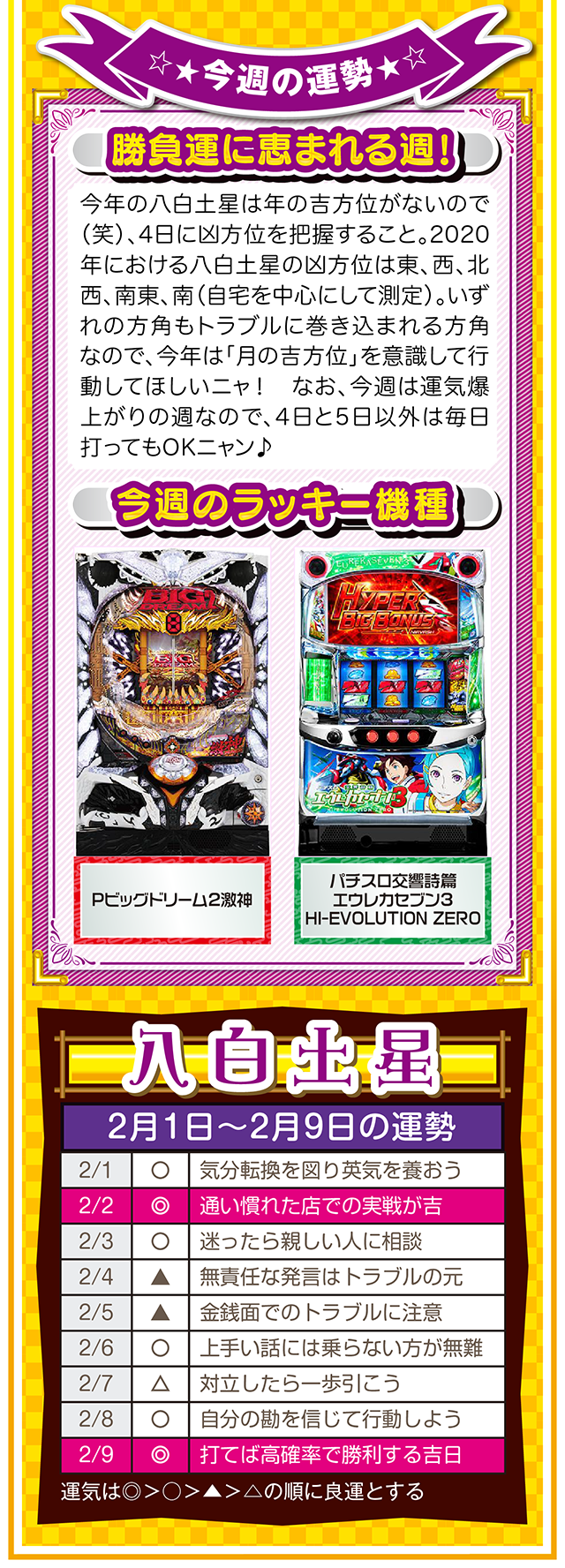 良い運気は待っていても訪れないので、とにかく行動あるのみ。今年も大吉日は訪れるので(大吉日は近日公開予定)、その日は運気を上げるためにもお水取りに出かけてほしいニャ(特に三碧木星・四緑木星・九紫火星の人)……というわけで早速、2月3日から9日の1週間を鑑定ニャ(変化運のフォー・チュンチュンは苦手なパクチーを頬張りつつ、オマケとして1日と2日の運勢も鑑定したニャン♡)!