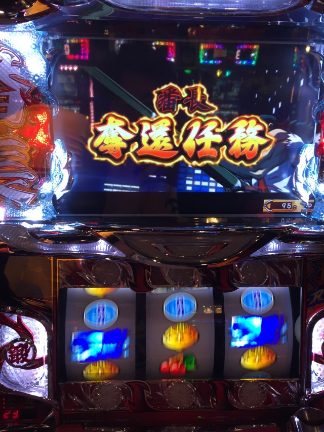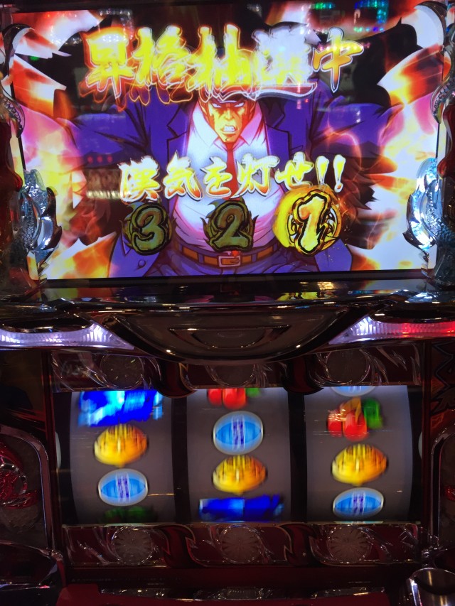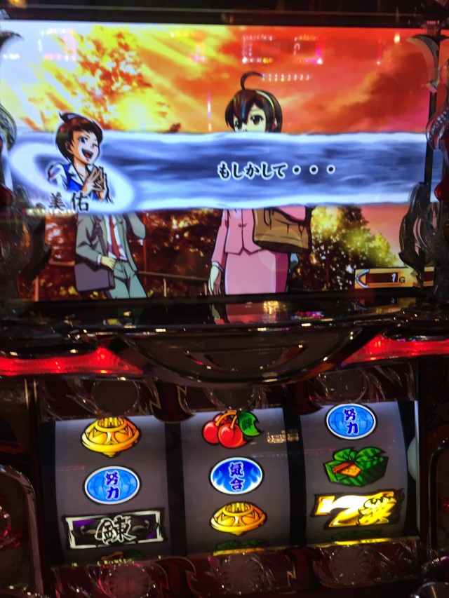 ※7を狙え演出でこのように上段に金7が止まれば青7確定なのでご参考までに