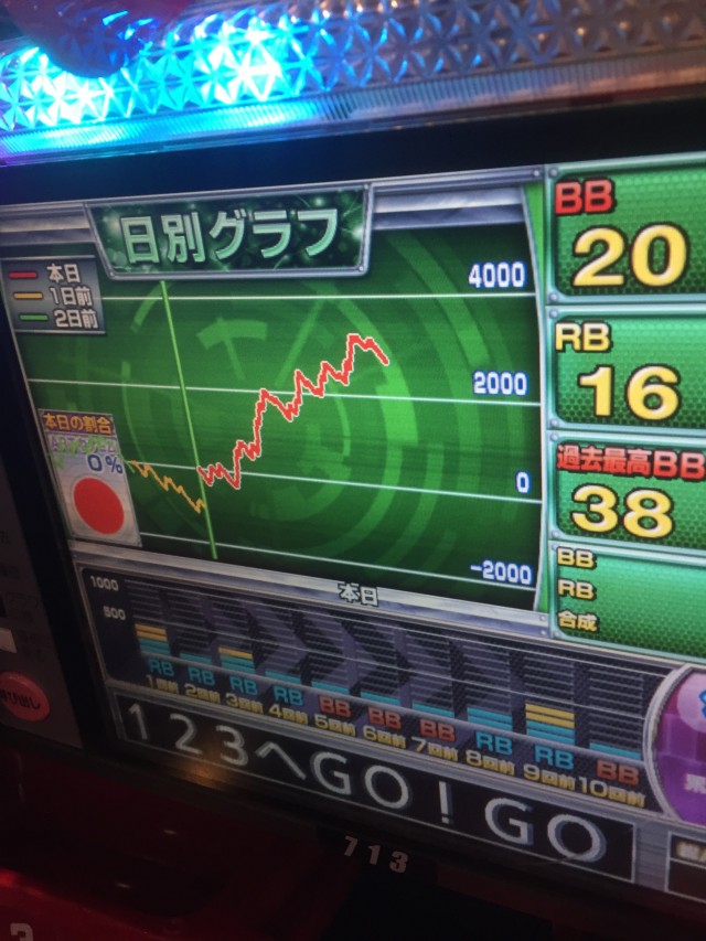 ハナビは前任者と合わせBB中のハズレが二回、小役確率・RB確率など全てが6の数値で落ち着いた所で移動の時間が来てしまったのでタイムアップとなりました。