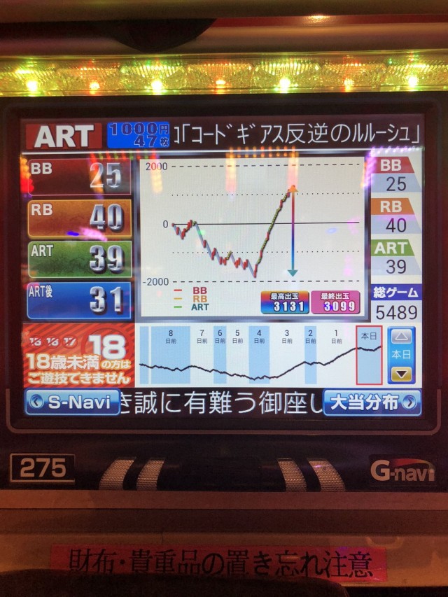 朝はリセットで格納庫へ、ギアスは高設定ほど高確スタートが高くなるのでプラス要素ですね~