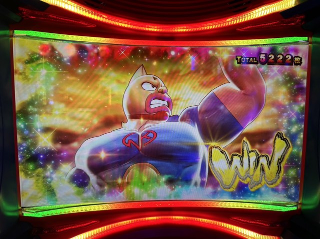 で、先日、ふらっとホールに入り、最近お気に入りのキン肉マンに着席。打ち始めると投資1万円で通常BのゾーンでAT当選。さあ頑張るぞと気合いを入れようとしたら、AT開始時の赤7がテンパイしたときに「悪魔の力を思い知れ」のボイス。