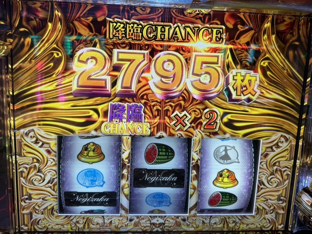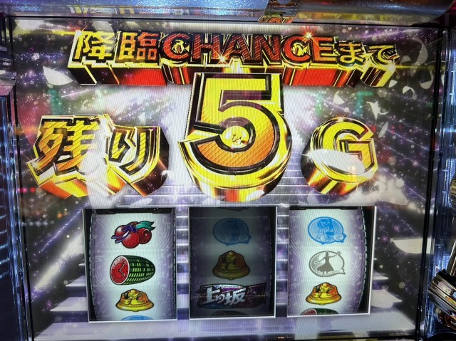 エンディング後は降臨チャンスに突入して、成功するとAT引き戻し確定(成功期待度70%)。さらに降臨チャンス経由のATは終了時に再び降臨チャンスに突入するので、実質70%でATがループすることになる。なんでも、このことを「ぐるぐるループ」と言うらしい。