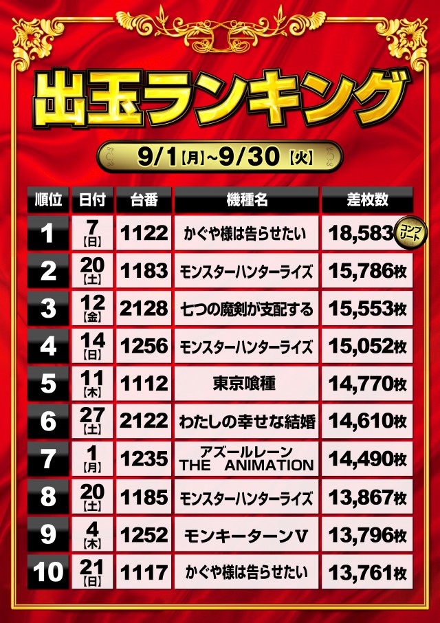 1位 10月5日(日) 2位 10月7日(火) 3位 10月6日(月)