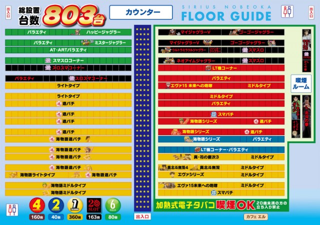 2024年12月6日総設置台数803台へ!20スロ増設29台増台リニューアルオープン!当店は加熱式・電子タバコ喫煙エリアをご用意しており、地域最大級の喫煙エリアには、4パチ160台、2パチ40台、1パチ100台、20スロ123台を設置中!且つ地域最大の店内喫煙所もあり、紙巻タバコのお客様も安心です♪♪無料Wi-Fiも簡単ログイン可能なので長くゆっくりご遊技できます♪