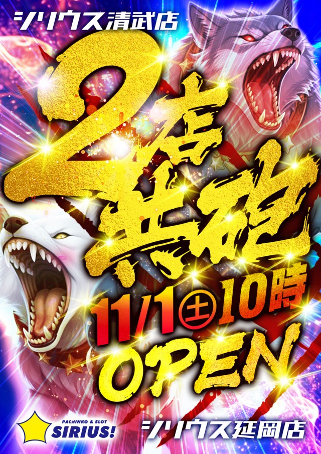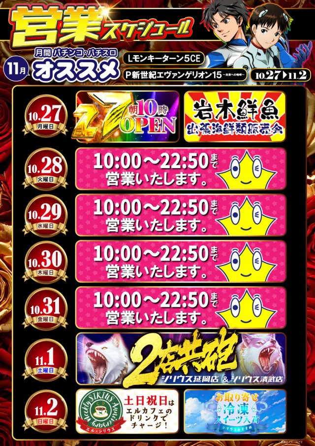 本日10/27(月)シリウス延岡店は変わる!変化は進化だ!!本日朝10時~22時50分まで元気に営業致します!朝の入場抽選は9時37分~開始!!