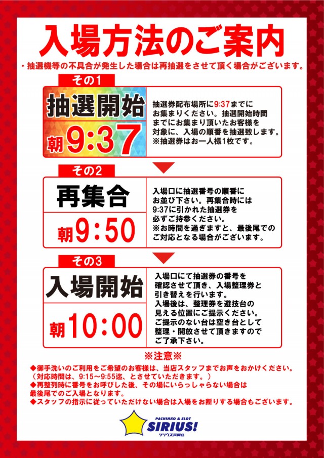 毎朝9時37分より正面西側入口前にて抽選。 |