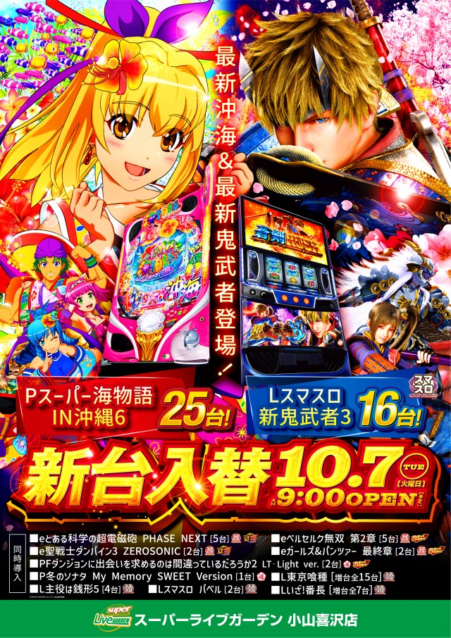 スーパーライブガーデン小山喜沢店9月29日にオーディンが舞い降りた場所は「スーパーライブガーデン小山喜沢店」!活気に包まれたホールにて、降臨シリーズを敢行した!! パチスロの状況をうかがうと、新台の『L戦国乙女4 戦乱に閃く炯眼の軍師』が満席…