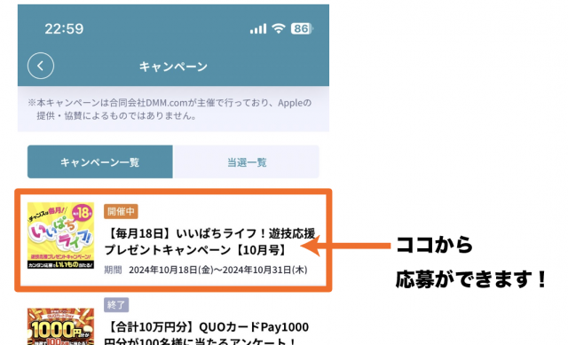 TOPに「キャンペーン」アイコンが見当たらない方は、もしかしたらアプリのバージョンが古いかも? App StoreやGoogle Play ストア からポチッとアップデートをお試しください。