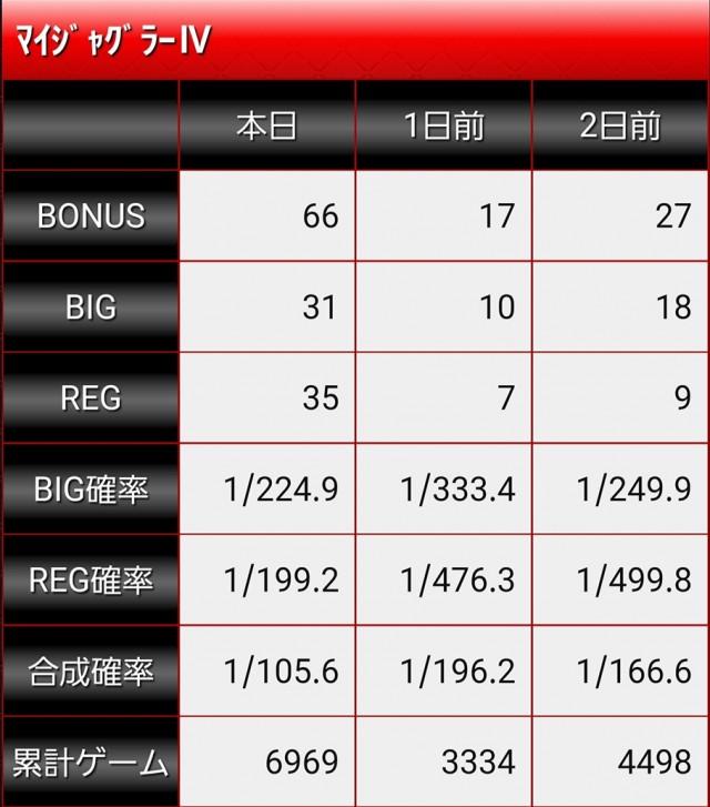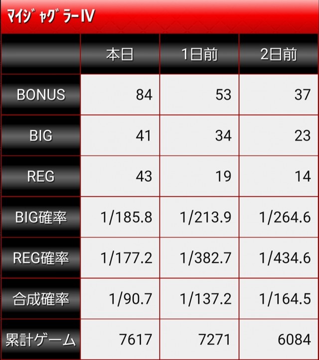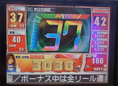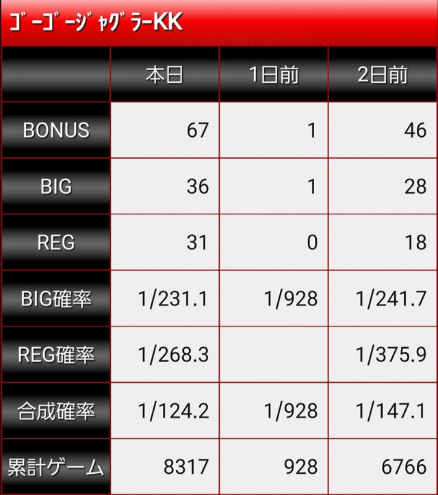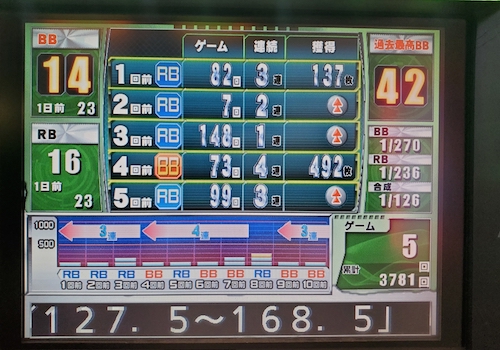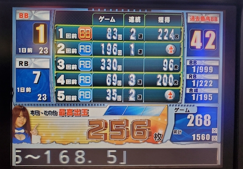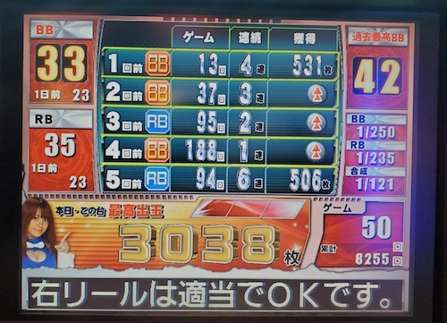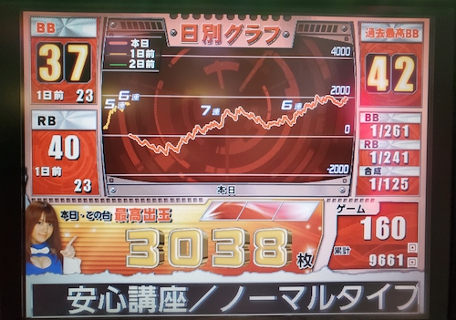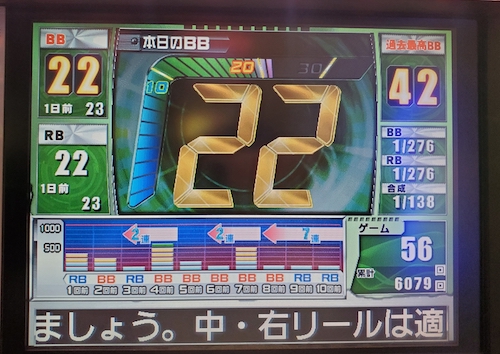 ボーナス確率、スランプグラフ、周りの状況下からして高設定、5or6は間違いないかと。